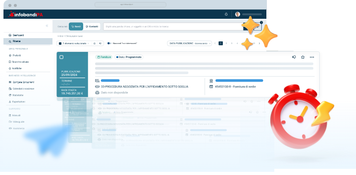 Monitora i tuoi settori di riferimento, accedi istantaneamente a informazioni sempre aggiornate e mantieni il pieno controllo sulle opportunità di gara.